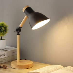is a desk lamp featuring a wooden base, combining elegance and functionality.